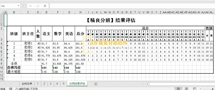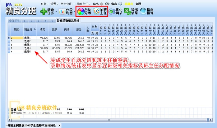 根据阳光分班流程设置,学生自动分班与班主任抽签可以合并进行,也可以分开进行。当学生分班与班主任抽签分班进行时,先后点击“自动分班”或“抽班主任”按钮就可以了,谁先谁后无所谓。分班和抽签完成后,我们可以看到所有班级相关均衡指标的汇总统计表,班主任也已经随机分配到各班级中。