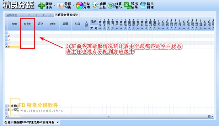 在自动分班之前,“各班级录取情况统计”表中还没有任何的分析数据,各班级班主任列也同样空着。
