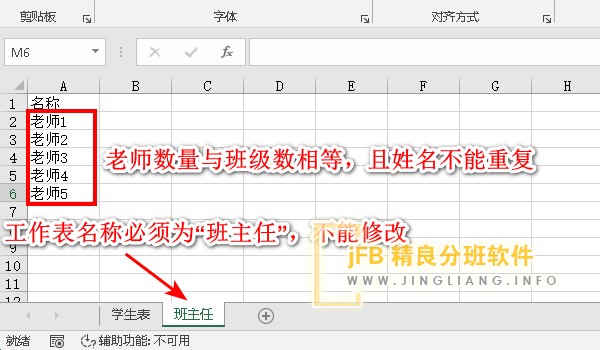 2、 老师数量与班级数量一致,如果您需要将学生表中的学生分成5个班,那么在班主任工作表中就需要填上5个班主任老师姓名;老师的姓名不可以重复