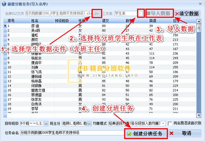 在分班任务创建界面,我们选择准备好的学生数据表文件(含班主任信息),选择学生名单所在工作表,如上步骤中图示中的工作表——“学生表”,点击“导入数据”按钮,系统将连同班主任信息一并导入分班软件中。
